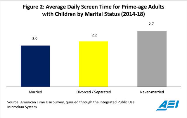 Also of concern, this trend is not only true for teenagers living in single-parent families, but for their parents as well. As figure 2 shows, married parents spend less time on average watching television, playing games, and using a computer for leisure than divorced and never-married parents. With children in single-parent families already at a higher disadvantage when it comes to life outcomes and overall well-being, parental screen time use could compound these disadvantages.