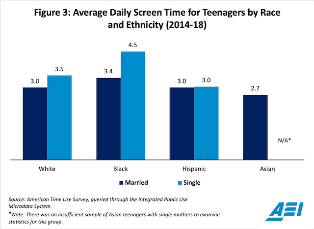 This divide in TV consumption does not just play out across family structure, but race as well. As figure 3 shows, Black boys and girls in single-parent homes spend the most time in front of a screen compared to their peers in married families. Asian teens in married families, on the other hand, spend less time in front of screens than any of their peers.