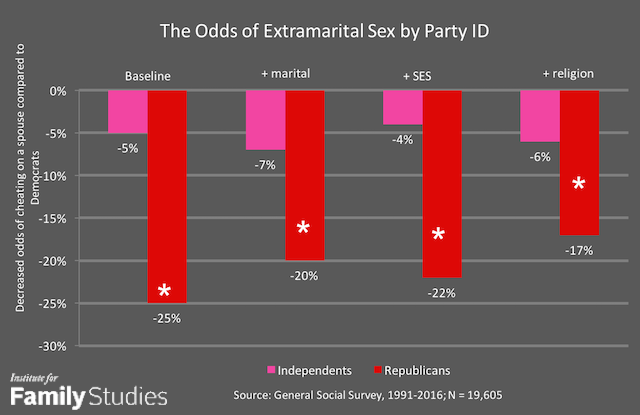 It’s not that much easier to understand the strong effects of party identification on marital infidelity. Democrats and independents cheat on their spouses at equal rates, but Republicans have starkly lower rates of infidelity. Controlling only for survey year and basic demographic differences between respondents (age, sex, race/ethnicity), Republicans have 23% lower odds of cheating than do Democrats. The adultery gap between independents and Republicans is nearly as large.