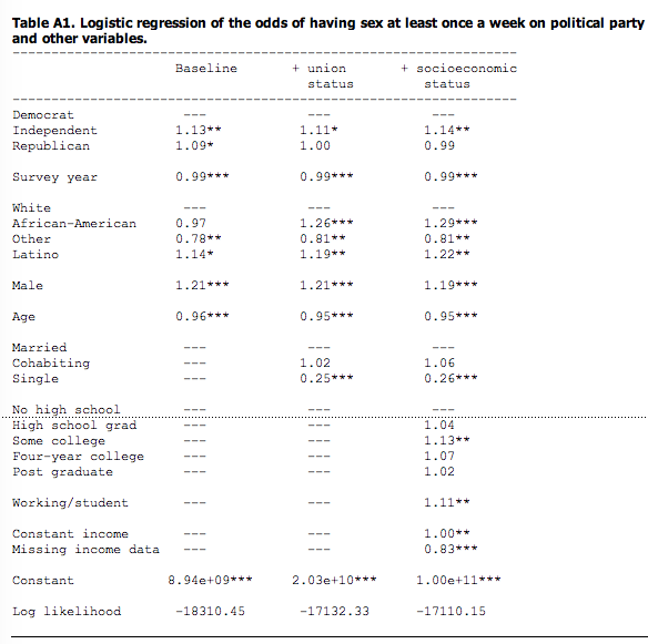 Even after adjusting for differences in relationship status—single, married, cohabiting—and SES, independents are still more likely to have weekly sex than are Democrats or, for that matter, Republicans. What gives? Political science suggests that a relatively small number of independents are probably responsible. Published 25 years ago, The Myth of the Independent Voter showed that most independents are really just crypto-partisans in their beliefs. As such, we would expect them to behave more like either Democrats or Republicans. True independents, small in numbers, are generally detached from political beliefs, let alone political participation. Why these independents may be especially sexually active awaits future inquiry.