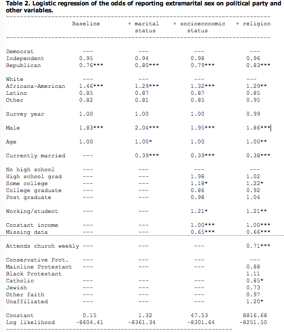 Note: * indicates that the gap in extramarital sex between Republicans and Democrats is statistically significant.