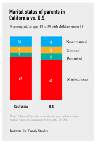 It is striking, then, that a new Institute for Family Studies (IFS) report finds that California—despite being a global force for cultural liberalism—actually has a higher share of stable, married families than the nation as a whole. About 67% of California parents are in intact marriages, compared to 63% of American parents, according to an IFS analysis of the Census data. Likewise, 65% of children ages 0-17 in California reside with their married, biological parents, compared to 62% of children in the United States. In other words, family life in the Golden State is more stable than in the country as a whole.