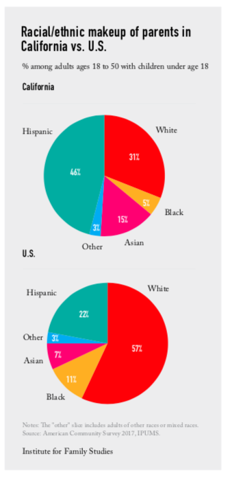 One factor that looms large in the state’s family story is California’s exceptionally diverse immigrant population. Immigrant families are more likely than native-born families to be intact; this is true for Asians above all. Compared with U.S. parents overall, California parents with children under age 18 are more likely to be Hispanic or Asian, and less likely to be white. The largest ethnic group in California is Hispanic, making up 46% of all parents ages 18 to 50. About 15% of parents in California are Asian, twice as many as the share among U.S. parents (7%). Only about 3 in 10 parents in California are white, compared with 57% in the nation.