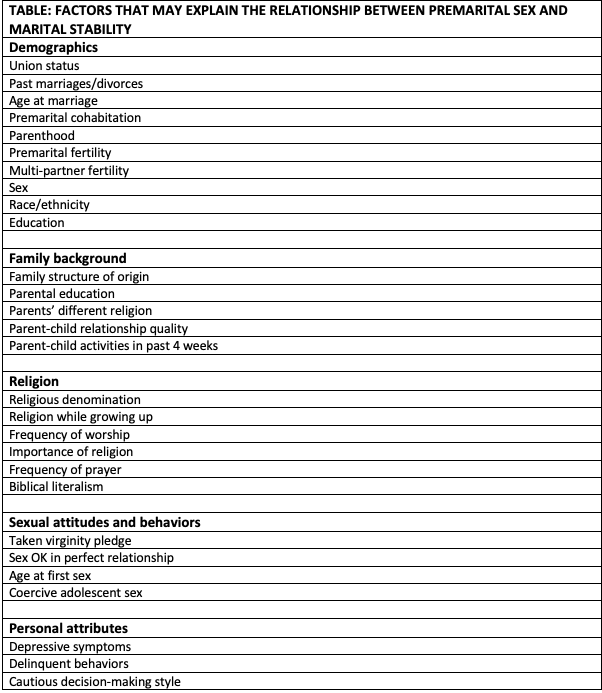 - Our results suggest that none of the commonly theorized explanatory mechanisms can account for the relationship between premarital sex and divorce rates. Post This