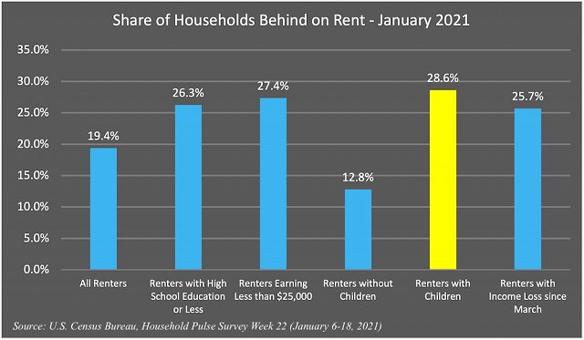 Nearly 20% of all renters were behind on their rent payments in January. Rent delinquencies were particularly high among families with children in the home. Nearly a third of renters with children were behind on rent payments—over double the rate of renters without children.