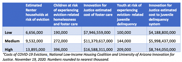 When families are evicted, many end up doubling up in friends’ and families’ homes, living in motels or in their cars—functionally homeless, even if they are not counted in the official federal statistics. Housing instability and homelessness are catastrophic for the well-being of families but also have costs to society. Among other consequences, families who lose their homes are at higher risk of becoming involved with the child welfare and juvenile delinquency systems. A recent report from the National Low-Income Housing Coalition estimates that the potential costs to local child welfare and juvenile delinquency systems from family evictions nationwide range between $12 billion and $25 billion.