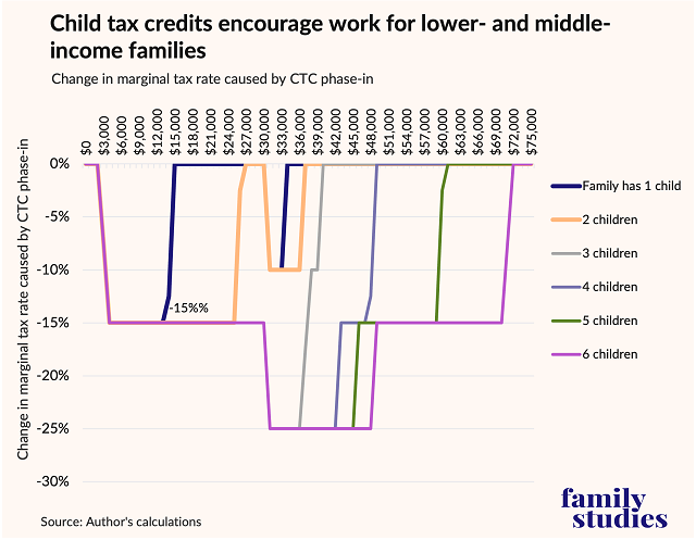 The figure below shows the work incentives created by the CTC for households with different incomes and numbers of children. It shows, for example, that families with any number of children have a -15% tax rate effect from the CTC at around $8,000 in income—that -15% effect vanishes as income rises based on when credits are fully “phased in,” and interaction with the “nonrefundable” element of the credit.