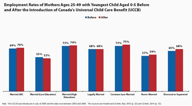 In my 2016 paper, "Toward a Universal Child Benefit," I argued that a fully refundable Child Tax Credit (i.e. a child allowance) would be able to meet the child care needs of parents while preserving family style choice. Weissman pooh-poohs cash payments, however, because they don’t foist maximal labor force participation onto parents. Yet after Canada enacted a national child allowance in 2006, employment rates for mothers actually increased across the board.