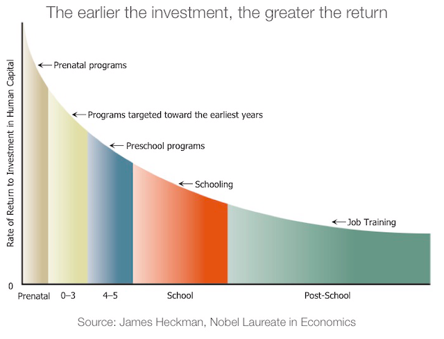 It’s impossible to delve into the child care debate without running into the name James Heckman, a Nobel prize-winning economist, famous for his work on human capital development and early childhood education. According to Heckman, “The highest rate of return in early childhood development comes from investing as early as possible, from birth through age five, in disadvantaged families.” This is shown in the famous Heckman Curve, a stylized representation of the return on human capital investments at different stages in life: