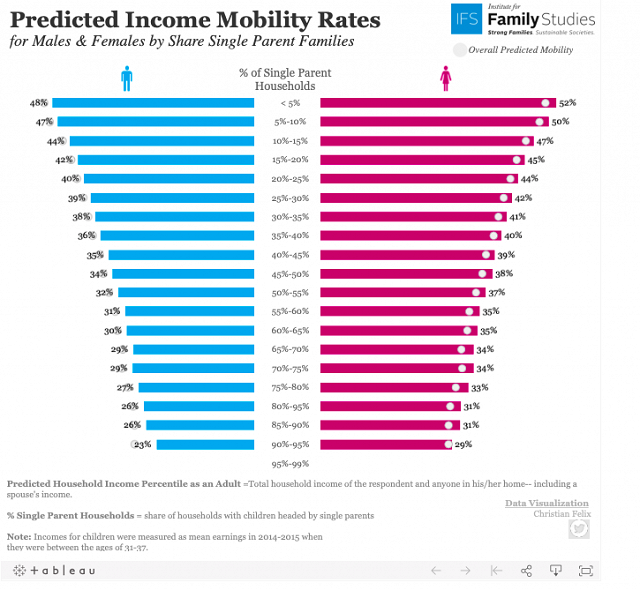 Indeed, Figure 1 indicates that mobility for children who were raised in lower-income families is higher for the kids raised in neighborhoods with lots of two-parent families, and lower for the kids raised in neighborhoods with more single-parent families. Specifically, boys and girls raised in families with a household income in the 25th percentile were much more likely to escape poverty as adults when they were raised in communities replete with two-parent families.