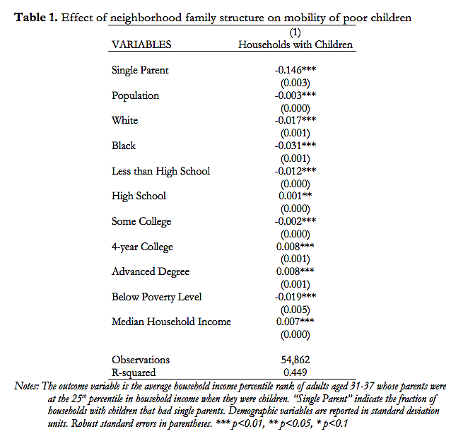 Table 1 indicates that the share of single parents in a neighborhood is statistically significant and the best predictor of mobility for poor children in a neighborhood—at least in comparison to other standard predictors of mobility—when we look at all households with children in a given community. The bottom line here: the family structure that defines and dominates the village is powerfully predictive of economic mobility for poor children in America, even after controlling for other socioeconomic factors that might confound that relationship.