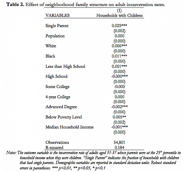 Moreover, in a multivariate context, one of the strongest neighborhood predictors of incarceration for young men from lower-income families is family structure. Table 2 indicates the share of single parents in a neighborhood, it turns out, is a bigger predictor of incarceration in adulthood than race, education, and poverty in a neighborhood. Here, then, we have yet more evidence that family structure at the community level is strongly linked not only to economic mobility but also to incarceration. Indeed, this suggests that one mechanism that explains why family structure matters for the economic mobility of boys is that it influences the odds that they run afoul of the criminal justice system.