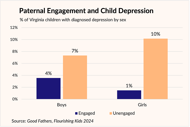 The story is mirrored when it comes to girls and depression. Girls with engaged dads are 9 percentage points less likely to be diagnosed as depressed, compared to their peers with less involved dads. By contrast, boys with less involved dads were just 3 percentage points less likely to be depressed. Clearly, good dads make for less-depressed girls and better-behaved boys in Virginia.