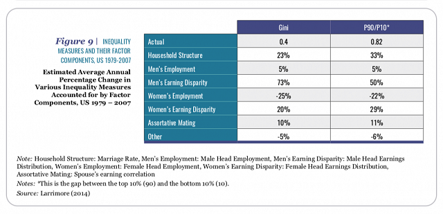 The Coleman Report (1966) in the U.S. demonstrated that family structure and family environment have a much stronger influence on learning disparities than school quality. Household structure plays a major role in shaping U.S. inequality. There is an inherent difference between single-parent households and two-parent households: on average, the single-parent household has fewer resources than a two-parent household. Single-parent families in which a child’s parents never married, usually have the mother as the sole earner. She is typically less educated and hence earns a lower wage. Single-mother households tend to have substantially fewer financial resources compared to nuclear families. In fact, modern American society’s highest family income quintile largely consists of two-parent families with both partners being high-earners and highly educated.