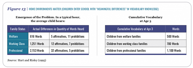 For the children of disadvantaged families, the verbal environment consists of hearing roughly 600 words an hour. In comparison, children of highly educated parents might hear more than an average of 2000 words, roughly 3.5 times more words per hour. By age three, the cumulative vocabulary of a child living in a disadvantaged family is 500 words, far below the 1,100-word cumulative vocabulary possessed by a child from a professional family. The effects of this difference cumulate, resulting in the “30-million-word gap” at age five, popularized by Suskind et al. (2015). This early gap of basic skills tends to persist throughout life, leading to economic inequality and social immobility.