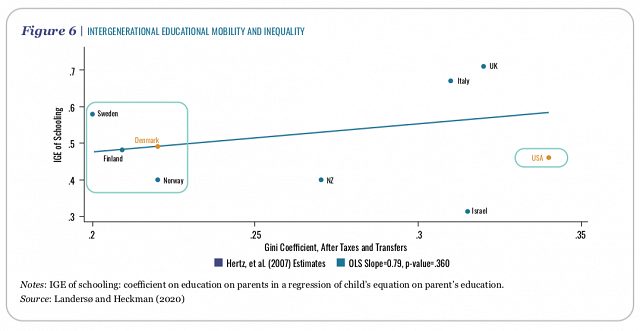 Despite universal and equal access to health care, childcare, free college and secondary schooling, there are large gaps in children’s outcomes between those of highly educated mothers and those of less educated mothers that are equally high in the US and Denmark (see figures 7 and 8 in the full report). In light of the equalizing policy of the Danish government in making expenditures on the schools in all neighborhoods, it can be surmised that family factors play a powerful role in perpetuating inequality.