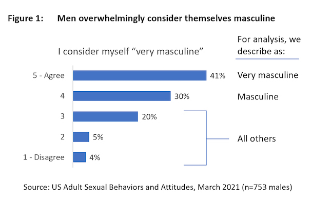 Recent data collected in the March 2021 U.S. Adult Sexual Behaviors and Attitudes survey lets us explore the supposed masculinity problem. In that survey, 753 men were asked if they considered themselves very masculine on a 5-point scale.1 Fully 41% of men agree that they are very masculine, or checked 5 on that scale, and another 30% consider themselves masculine, or checked 4 on that same scale. And when asked if they are happy with how masculine or feminine they are, 80% of men further reported being happy (not shown).