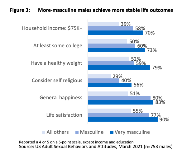 First, men higher in feelings of masculinity also report more stable and resourced life outcomes, including higher income and education, a healthier weight, greater religiosity, and increased general happiness and life satisfaction, as shown in Figure 3.