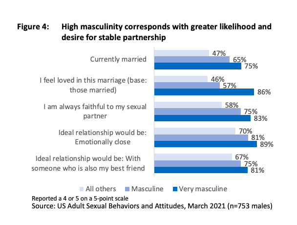 But what about the ability of these men to have healthy, nurturing relationships—which is clearly a problem for masculine men, right? Not so fast. In fact, this survey shows that very masculine men are also the most likely to marry and to report feeling loved in their marriages. Unlike the image often presented in our culture, these very masculine men are more likely to seek emotional closeness and friendship with their ideal partners—and are the most likely to report being always faithful to their sexual partners.
