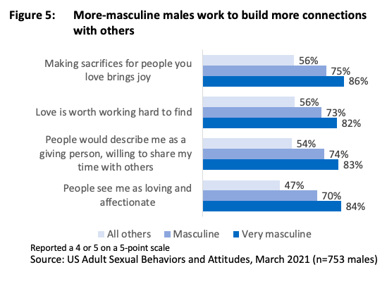 It’s likely that these stable personal and intimate life outcomes are the result of these men’s hard work and efforts to provide for and take care of those around them. These very masculine men are also most likely to say that making sacrifices for loved ones brings joy, to agree that love is worth working hard to find, and to believe that others see them as giving, sharing, loving, and affectionate.