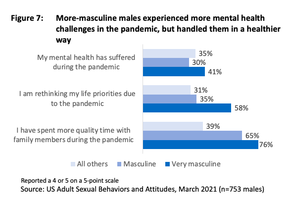 This is not merely theoretical. During the pandemic, as many have struggled to adapt, very masculine men were not exempt. Counter to stereotypes, these men reported as much or more mental health difficulties during the pandemic than average men (see Figure 7). But they also expressed a willingness to put in the work to address these challenges, reporting spending more quality time with their family and being willing to rethink life priorities due to the pandemic.