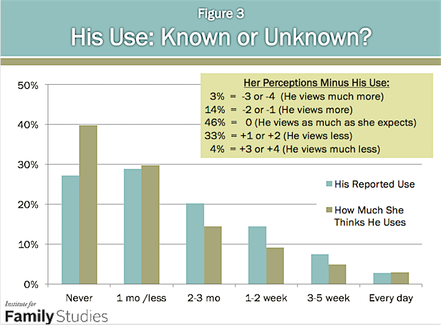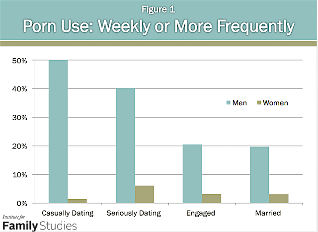 For example, only 4% of women in casually dating relationships reported that their partner uses pornography weekly or more often, but 50% (13 times as many) of casually dating men reported weekly or more frequent use. In fact, none of the casually dating women reported that their partner uses pornography almost daily or every other day, but 43% of casually dating men in our sample reported this level of heavy use.
