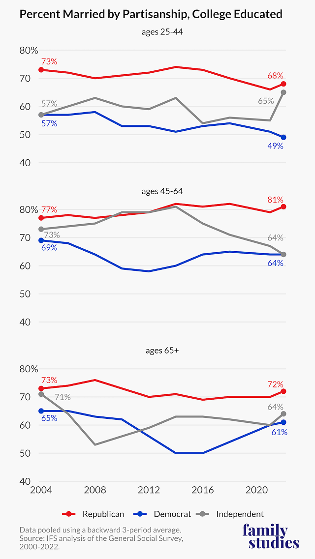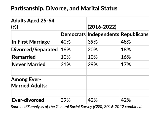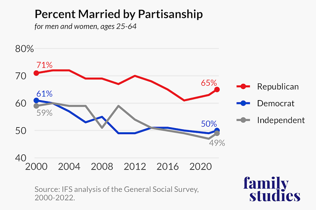- Republicans continue to be markedly more likely than Democrats to be married—and this is true for several subgroups in the population, according to a new IFS research brief. Post This