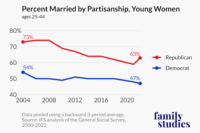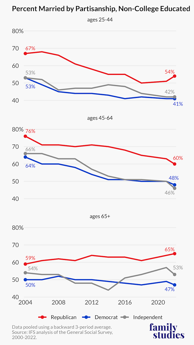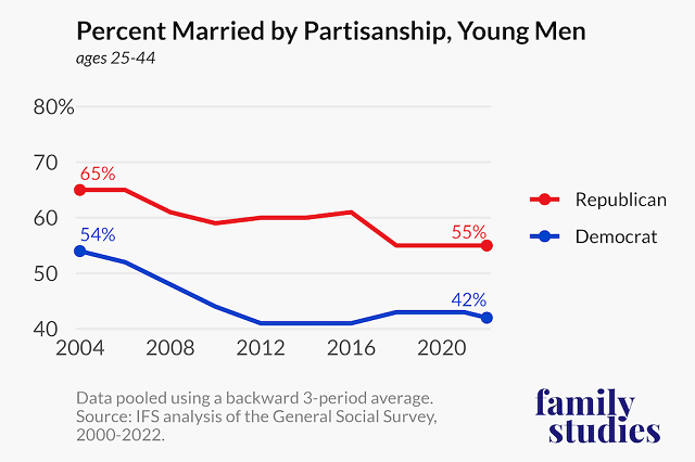 Take less-educated young adults: From the early twenty-first century to the present, the share of men and women aged 25-44 who are married fell around 13 percentage points for both Republicans and Democrats, according to the GSS. The average overall decline in marriage from 2000 to 2022 for less-educated Americans aged 25-64 was 11 percentage points, according to the ACS. In 2022, 50% of less-educated adults aged 25-64 were married.