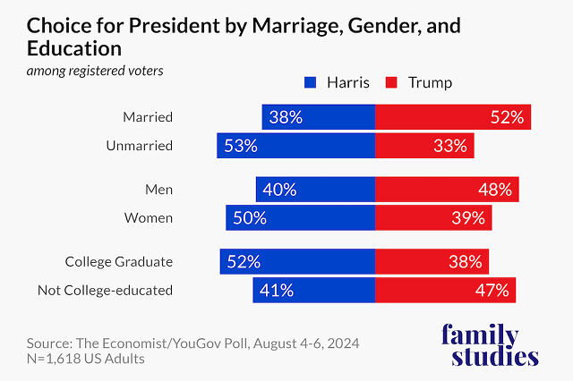 There was a time in American life when marriage trends were not as polarized along political lines. But this has changedin recent decades, as Democrats have become especially likely to delay or forego marriage. Consequently, a partisan divide has opened up in the share of men and women who marry, just as there is now a marriage divide in support for the Republican and Democratic parties. Indeed, a recent Economist/YouGov poll of more than 1,500 registered voters finds that a majority (52%) of married voters are planning on voting for Trump even as a majority (53%) of unmarried voters are planning on voting for Vice President Kamala Harris in the upcoming presidential election. The poll also reveals that the marriage gap is about as large as the gender and education gaps in presidential voting plans. For instance, the gap in support for Trump versus Harris is 14 percentage points among marrieds versus a female voter gap of 11 points, and a college-educated voter gap of 14 points in the opposite direction.