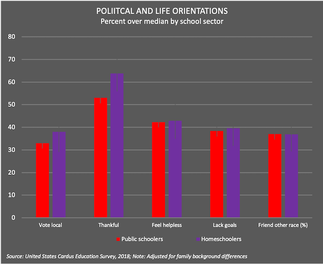 As an embattled political minority, we would not expect to find high levels of political participation among homeschoolers, except, perhaps, lobbying to defend homeschooling. Yet, according to the CES review of U.S. data, young adult graduates of homeschooling are nearly identical to public schoolers in their likelihood of voting in the 2016 presidential election.