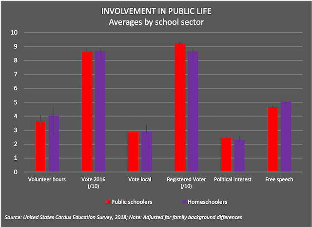 Homeschooling graduates likelihood of voting in local elections is also identical to public schoolers. They are slightly less likely to be registered to vote, but the two sectors have very similar levels of interest in politics.