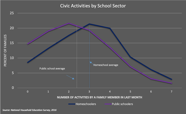 This civic involvement not only strengthens social capital and trust within communities, but also provides a “hidden” or implicit curriculum important for civic socialization, which may carry into young adulthood. In the 2018 CES, about 22% of homeschooled young adults said they know a leader in their community, which compares favorably to the public school average (19). The total number of volunteer and community service hours for homeschooling graduates is very similar to or slightly higher than public school graduates.