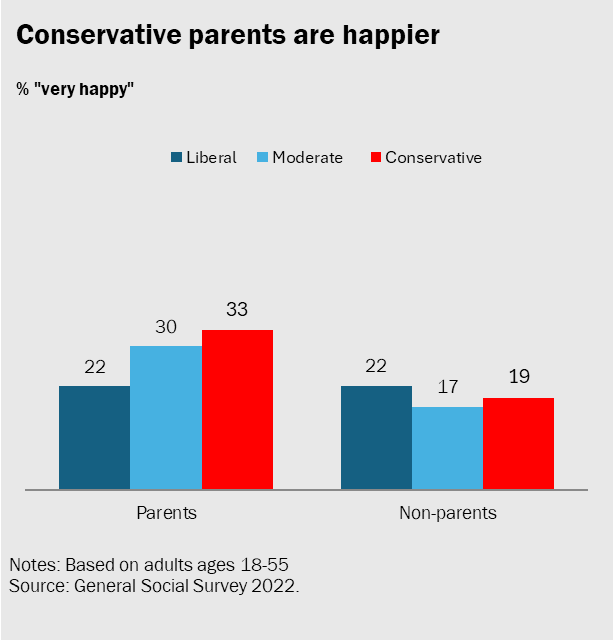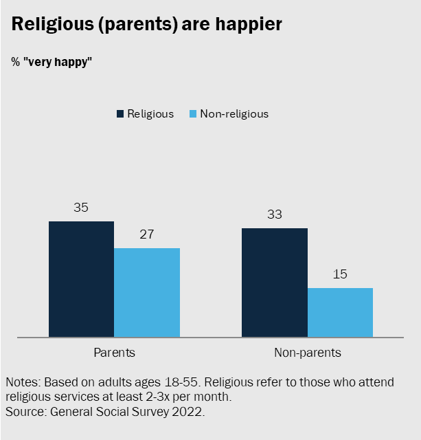 Additionally, the list of parents who are generally happier than their fellow Americans also includes religious and conservative parents. Why are religious parents happier? The rituals and religious teachings found in America’s churches, synagogues, mosques and other houses of worship endow parenthood — and the sacrifices required of mothers and fathers — with sacred significance. Religious communities also offer parents support they need to survive and thrive — from emergency rental assistance and date nights for couples, to church youth groups that help teens and parents navigate school and life more successfully. Religious parents are also more likely to be happily and stably married. More meaning, greater social support and higher-quality marriages add up to happier parents. According to the 2022 General Social Survey, 35% of religious parents are very happy with their lives, compared to 27% of parents who rarely or never attend religious services.
