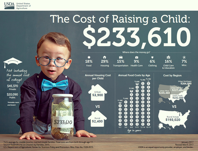 According to the USDA, parents in urban environments are spending 27% more per child than those in rural areas with their greatest cost being housing and food. You’ll find in the same report that higher-income families are also spending more per child seemingly to keep up with their peers and the rising expectations on parents (pressure that we’re putting on ourselves), spending more on schooling and miscellaneous costs than other families. It’s clear that parents are making the cost of raising a child more expensive than necessary, with higher-income families expected to spend, on average, more than twice the amount of families in the lower-income group.