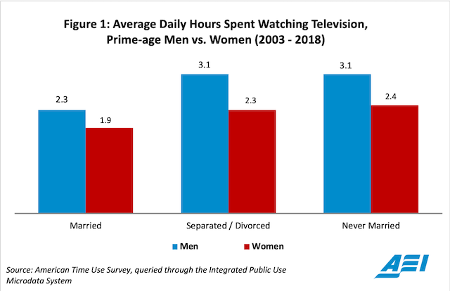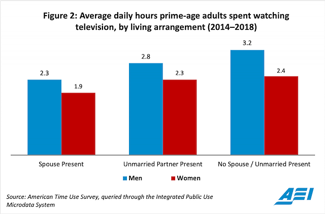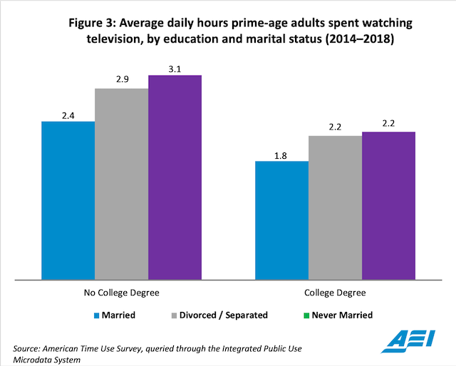 The data presented here reflect the reality that marriage continues to be an important anchor for Americans’ lives.5 Marriage provides structure and purpose, and it often fills people’s days with rewarding activities, whether that be taking a child to soccer practice, sharing a meal with family, or engaging in religious services with one’s spouse. Prime-age adults who experience unsuccessful marriages or who never marry tend to spend more hours in the day in front of the television screen, which likely has important ramifications for the happiness and satisfaction of these groups.