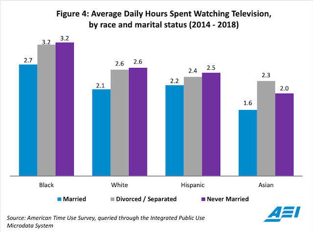 A similar story develops when looking at TV viewing habits by race and ethnicity. Within each racial and ethnic group, married adults spend less time watching TV than divorced, separated, and never-married adults (figure 4). However, unmarried White, Black, and Hispanic adults spend much more time watching television than Asians—a group that has escaped some of the concerning trends in the marriage divide.