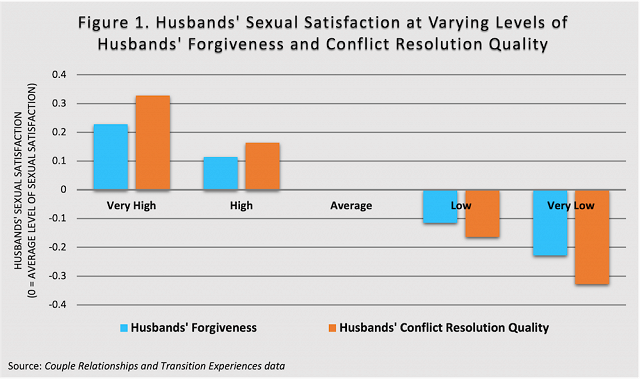 The narrative is the same for both husbands and wives: individuals with high levels of conflict resolution quality tend to have above average levels of sexual satisfaction, while individuals with low levels of conflict resolution quality tend to have below average levels of sexual satisfaction.
