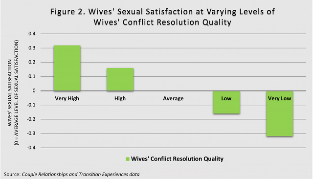 Of note, greater conflict resolution quality was connected to greater sexual satisfaction for both husbands and wives. This finding for husbands is represented above with the orange bars and below for wives with the green bars.