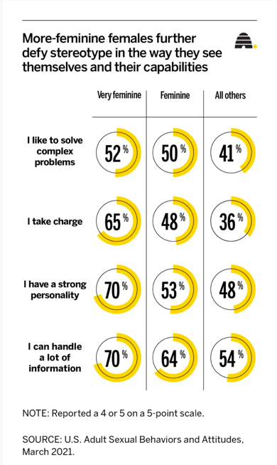 Moreover, the self-described “very feminine” women in the study agreed at a much higher rate than other women that they “have a strong personality” and like to solve problems and take charge.