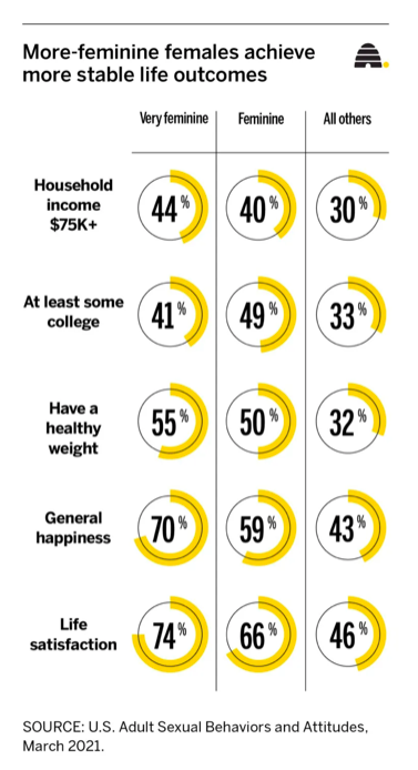 Lest we be disappointed that these self-described feminine women are missing their chance to lean into a more gender-fluid life, an analysis of the data suggests that the degree of femininity correlates with seemingly positive outcomes of women’s lives.
