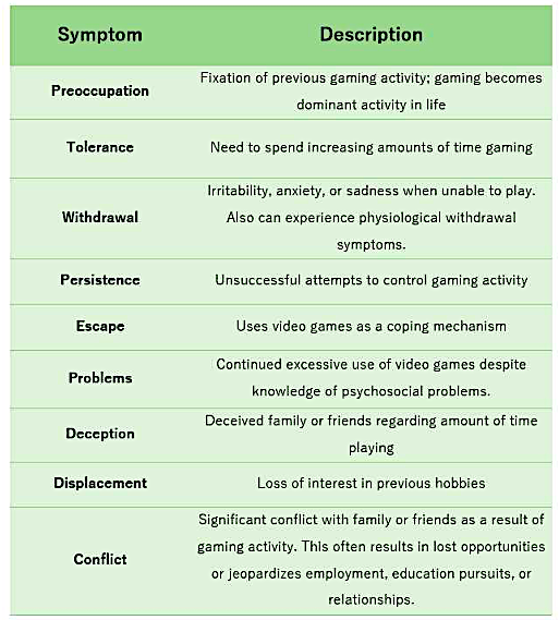 Pathological video game use (also called Internet gaming disorder) has been recognized by both the DSM-V4 and the World Health Organization as serious behavior worthy of future study. Most individuals who play video games are just fine–only around 10% of gamers will develop a pathological problem. There are nine main criteria that families should consider when deciding whether a child or spouse has a true problem with video games (see table below). A total of five of these must be met within a 12-month period. We see evidence of each of these symptoms in the example presented at the beginning of this article.