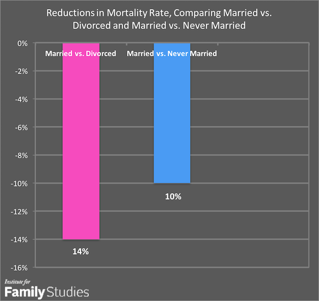 In fact, about 10 years ago, there were two systematic reviews of this literature using longitudinal data and objective health measures that suggested strong evidence for the protective effects of marriage on health and longevity. 5,6 A meta-analysis of 53 studies likewise found protective effects of marriage on the rate of mortality with a 14% reduction in mortality for married individuals compared to divorced individuals, and a 10% reduction in mortality for married compared to never-married individuals13 (see figure above).