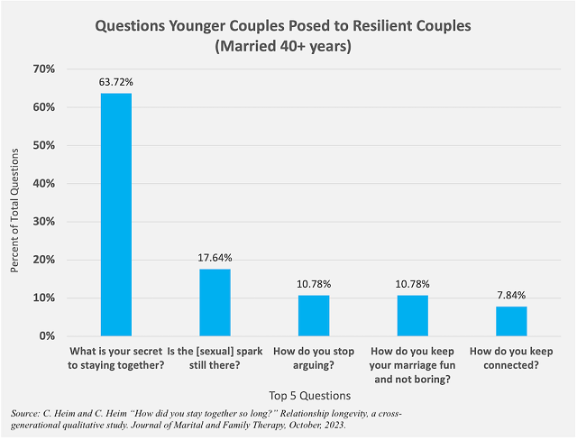 As researchers, we wondered if, to help nurture relationship resilience, younger couples felt they could benefit from the experience of older couples with proven resilience.1 The figure below highlights the questions younger couples in our study wanted to pose to resilient couples (married 40+ years).