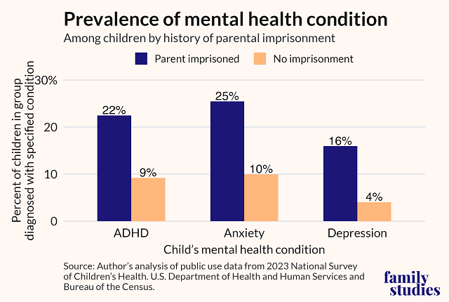 Depression, Anxiety, and Attention Deficit. Children with a parent who has been incarcerated are more likely to be diagnosed with mental health conditions than are children with no history of parental incarceration.