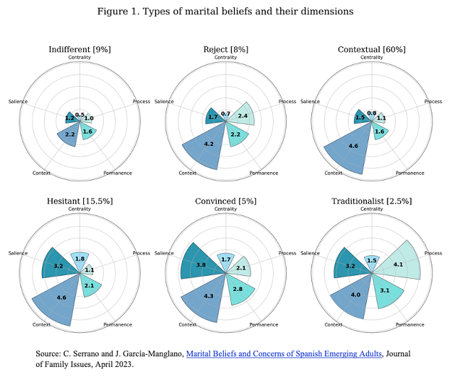 Surveying a representative sample of Spanish emerging youth (18-30 years old) we asked participants to report on particular opinions and attitudes reflecting marital salience (getting married is a very important goal), timing (there’s an ideal age to get married), context (money and finances are a major barrier to getting married), processes (in an ideal marriage, the man is the achiever outside the home and the woman takes care of the home), permanence (marriage is for life, even if the couple is unhappy) and centrality (how much importance do you expect to place on marriage?). Together, these variables were used to classify the population of participants into distinct classes based on a shared paradigm.