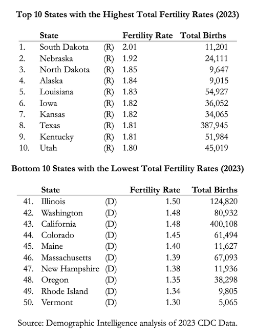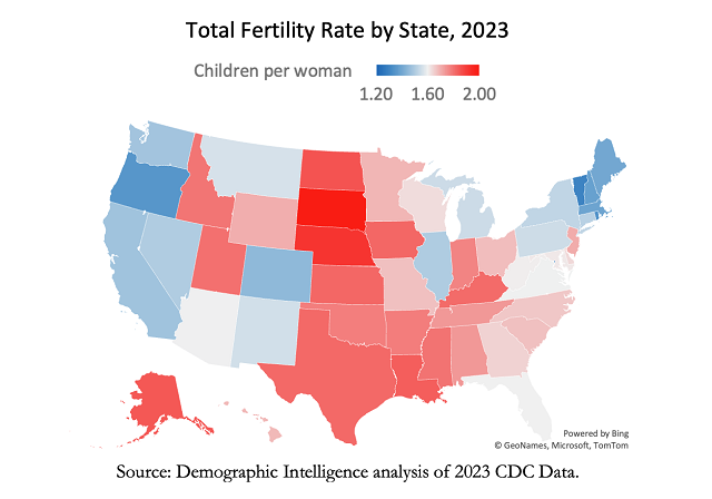 - The highest total fertility rates in 2023 were found in red states like South Dakota (2.01), Texas (1.81) and Utah (1.80). Post This