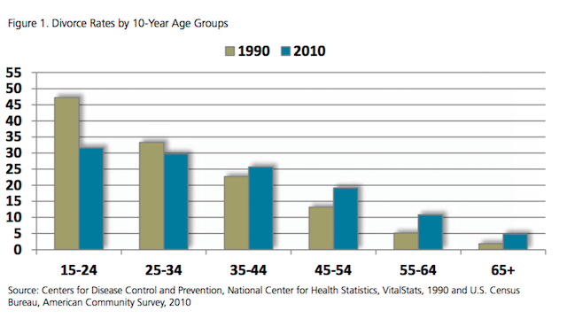 First, some good news for everyone: the divorce rate is still not all that high for those over the age of 50. Yes, it has doubled over the past 30 years: in 1990, five out of every 1,000 married people divorced, and in 2010, it was 10 out of every 1,000 married people. And yes, the rate has risen much more dramatically for gray Americans than for those under 50; in fact, there was a decline in the rate for those between the ages of 25-39. But the divorce rate for those over 50 is still half the rate for those under 50.