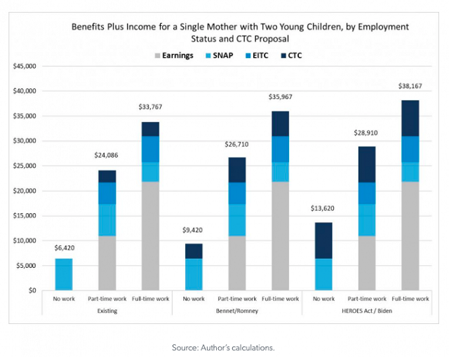 One trade-off is lower labor force participation. As I have previously argued, providing a fully refundable CTC to nonworking parents—which is a cash transfer, not a credit against taxes paid —would counteract some of the work incentives in the EITC. Under President Biden’s proposal, a non-working single mother with two young children would receive $13,620 per year from the CTC and SNAP, double what she would currently receive when not working. It is true that the EITC still incentivizes employment, but this dynamic weakens under an expanded CTC.