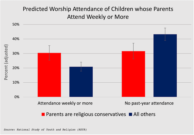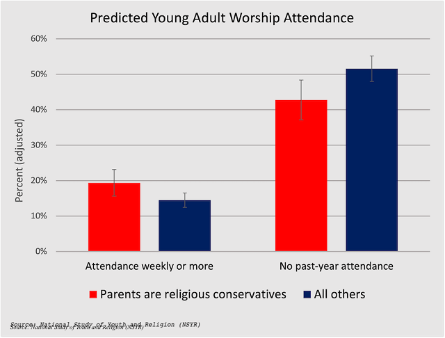 For instance, children of religious conservatives have a 19% chance of attending worship services at least weekly. This may sound low, but it's higher than the 15% chance we see in people from moderate or liberal families. At the other extreme, an estimated 43% of the children of religious conservatives report no worship attendance at all in young adulthood, compared to 52% for everyone else.
