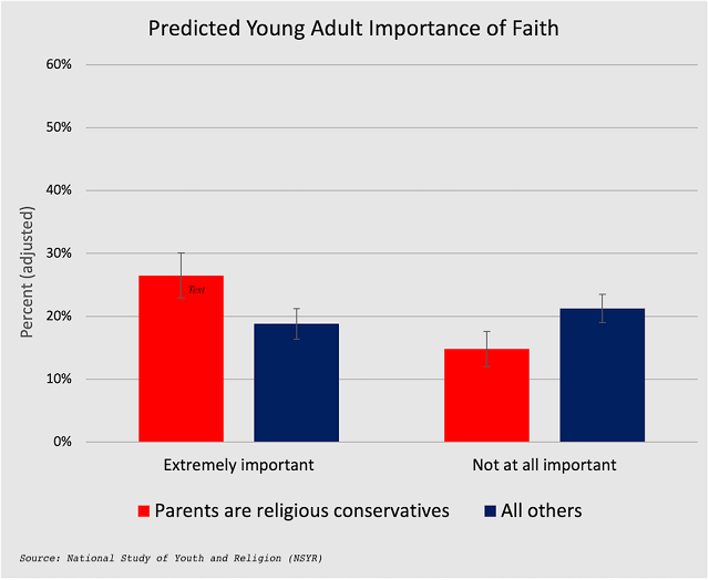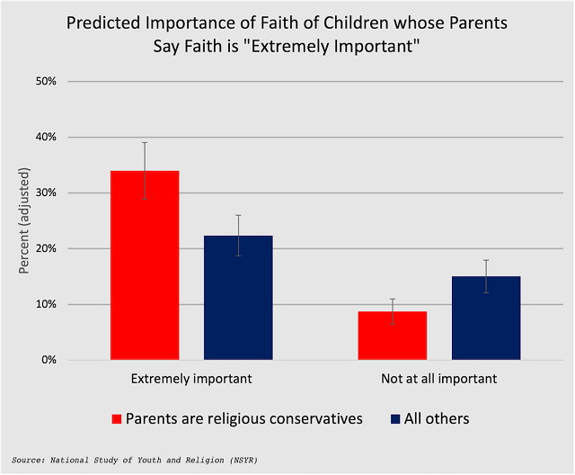 When we examine children's importance of faith only among parents who report the highest level of faith themselves, we see children of religious conservatives are about 12 percentage points more likely to agree that faith is of utmost importance, and 6 percentage points less likely to say it doesn't matter at all. Children of religious conservatives are more likely to match the religiosity of their parents, and when they stray, they tend not to stray as far.